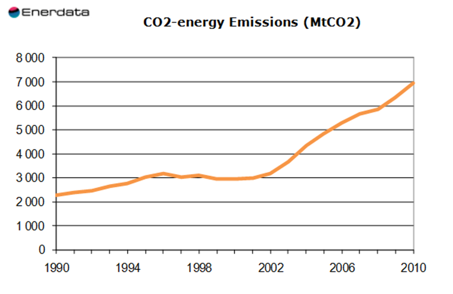 CO2 emissions from energy combustion have increased 2.4-fold since 2000. Compared to 1990, they have seen a 3.1-fold increase. During the 2009 Copenhagen Summit China announced its intention to implement policies aimed at reducing its greenhouse gas emissions, and set a carbon intensity reduction target of 40-45% by 2020. Accordingly, the 12th Five-Year Plan (2011-2015) aims at reducing carbon intensity of the overall economy by 17% (18% for industrial sectors).