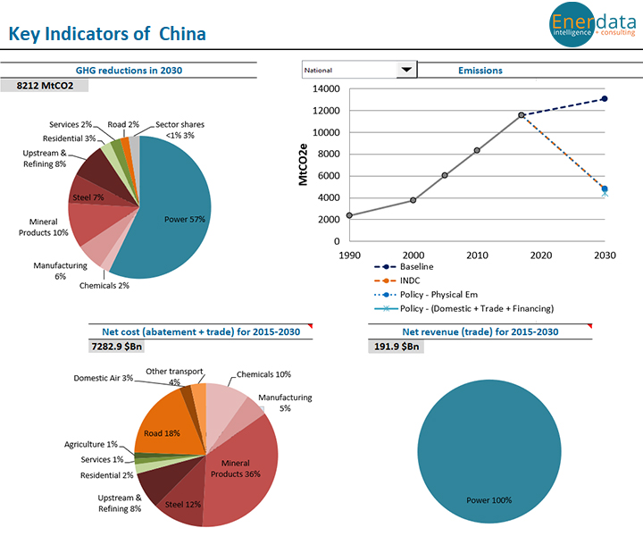 The EVALUATE model offers a comprehensive decision support to parties involved in emissions reduction strategies, both in mitigation levels and the corresponding economics impacts. It allows an in-depth understanding of countries pledges such as INDCs, and offers the possibility for the user to easily define the policy mix (including carbon taxes, trading schemes, international financing, etc.) to be implemented sector by sector, in order to achieve the economic optimum related to the fulfilment of a country’s reduction objective.