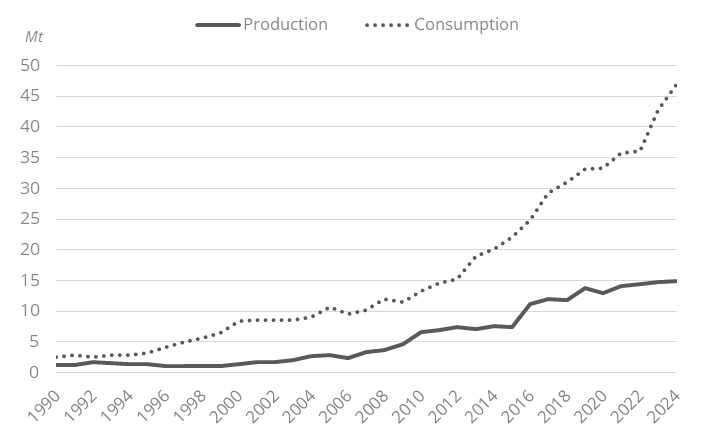 Lignite production has more than doubled since 2010 and reached 15 Mt in 2024 (+1.7% in 2024), though covering only 1/3 of domestic coal and lignite consumption. Coal imports have more than tripled since 2010, from 11 Mt to around 41 Mt in 2024 (10%/year). Most of the coal is used in power plants, with the remainder in industry.