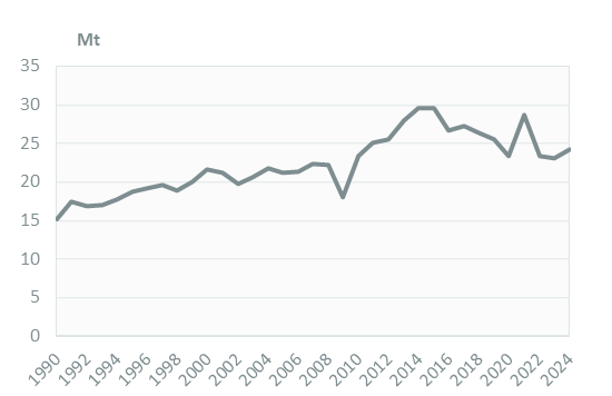 Coal consumption increased by 5% in 2024 to 24 Mt. It has been decreasing generally since 2014 (-2%/year), except in 2021 when it peaked at around 29 Mt due to the higher use of coal power plants to substitute weak hydro production.