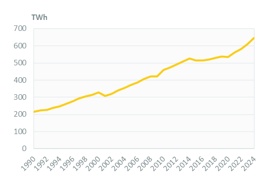 Electricity consumption has been increasing strongly since 2020, reaching 645 TWh in 2024 (+5%/year). Previously, it increased by around 0.8%/year between 2015 and 2020, after increasing rapidly between 2001 and 2015 (around 3.8%/year).
