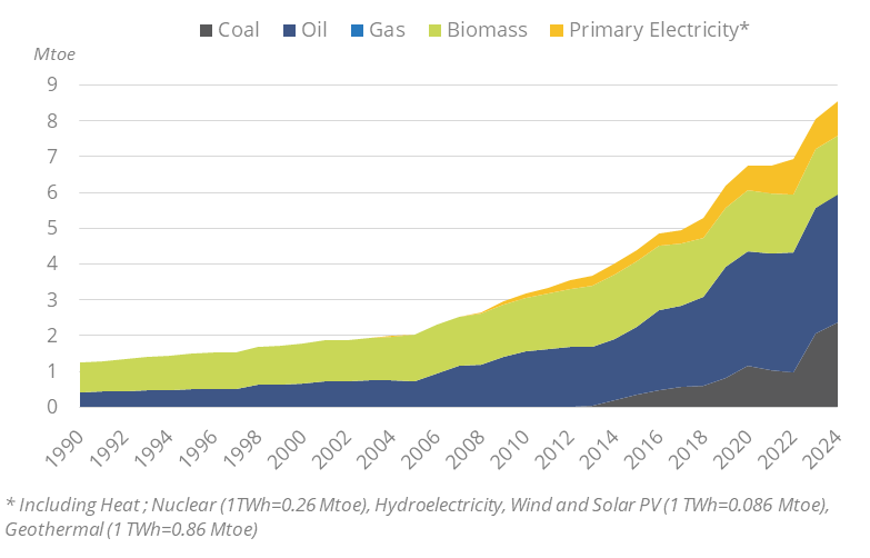 From 2013 onwards, the country started to import significant quantities of coal following the commissioning of its first coal-fired power plant. Driven by the rise in coal-fired capacity, imports were multiplied by 7 between 2015 and 2024, reaching 7 Mt. In 2023, most of the coal (89%) was imported from Indonesia.