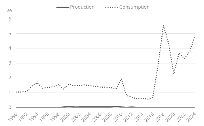 Egypt does not have any domestic production of coal and depends on imports. Coal consumption has increased rapidly since 2020 (+20%/year), reaching 4.8 Mt in 2024, a level close to its pre-Covid level. Coal is dominantly used in the industrial sector (89%), in addition to replacing gas when its prices increase.