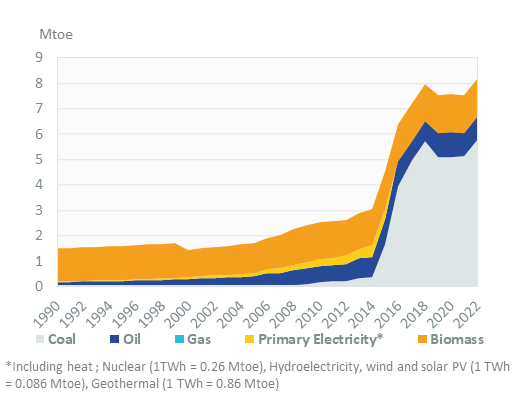 Total energy consumption increased by 9% in 2022 to 8.2 Mtoe. It surged between 2014 and 2018 (+27%/year), with the start of production of the lignite power plants, and remained stable between 2019-2021 (at 7.5 Mtoe).