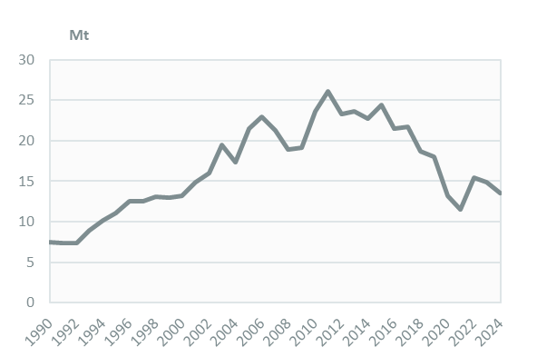 The demand for coal decreased by 6%/year over 2022-2024 to 13.6 Mt, after a 34% rebound in 2022. It decreased rapidly over 2011-2018 (-4.5%/year on average), with more striking reductions in 2020 (-27%) and 2021 (-12%).