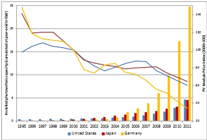 PV modules prices have fallen dramatically since 1995. This drop is the result of two main factors: the learning factor, which tends to reduce the average cost by about 20% for each doubling of cumulative installed capacity and the emergence of new low-cost Chinese manufacturers that have dragged prices downwards.
