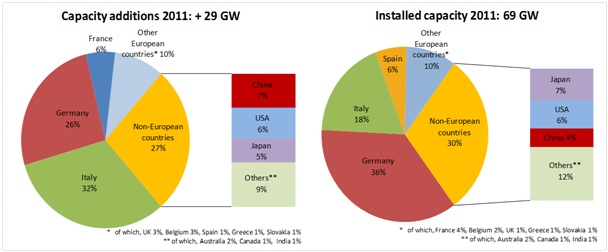 The year 2011 was a record year for the solar photovoltaic industry, with more than 29 GW new capacity installed worldwide, corresponding to a 70% increase compared to 2010. Global PV capacity exceeded 69 GW in 2011, with 70% installed in European countries.