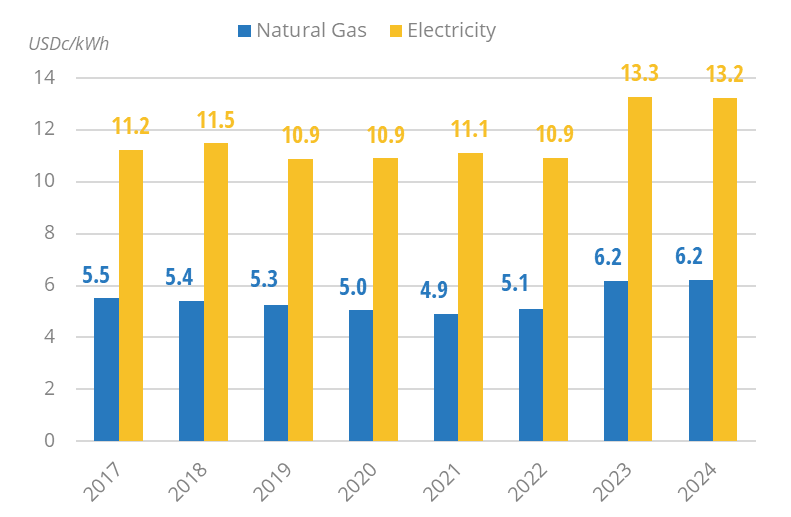 The household price remained stable in 2024 at USD6.2c/kWh for natural gas and USD13c/kWh for electricity. (+22% in 2023). They surged by 22% in 2023, following the global energy price crisis.
