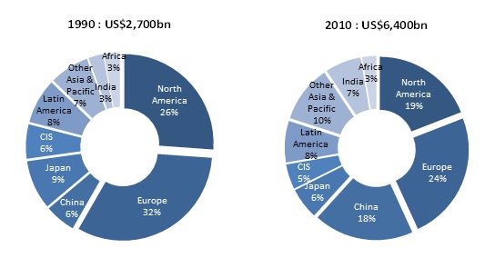 OECD countries contribute to more than half of the expenditures. Europe spends close to one fourth of the world energy expenditures, whereas Americans alones contribute to close to 20% and Japanese to 6%. However their share is decreasing steadily - as they represented two third of the spending in 1990 - due to the explosion of the energy consumption in developing countries and in particular in China. Indeed China who contributed to only 6% of the energy expenses in 1990 contributes now to about 18%; just below the United States contribution.