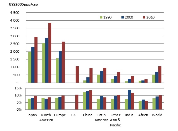 Booming growth rates of expenditures per capita in emerging countries, still far behind developed countries