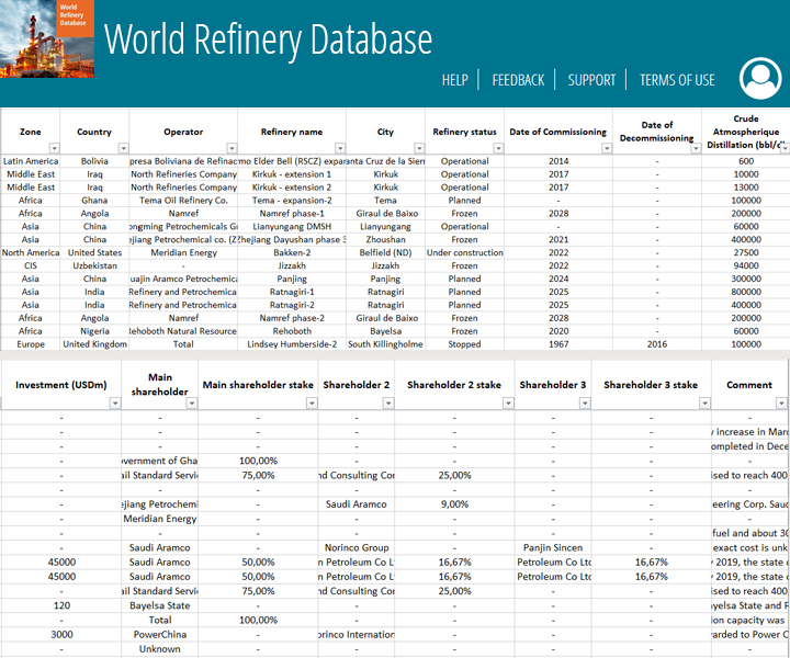 This is a very useful tool to assess the current and future production capacities of refined oil products by country and zone, offering information on almost 1 500 refinery units worldwide (97% of global refining capacity).
