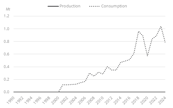 The country imported 0.8 Mt of coal in 2024. Coal is mostly consumed in industry (63%); the rest is used for power generation.