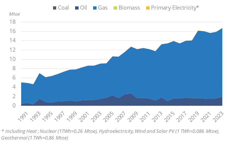 Total energy supply (i.e. total energy consumption) has been fluctuating around 16 Mtoe since 2019, after growth of 3%/year over 2010-2019.