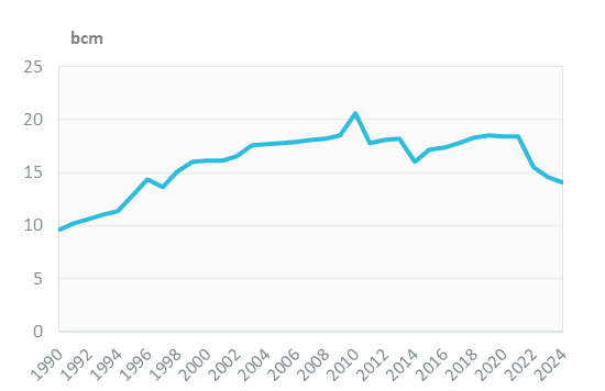 Gas consumption continued its decrease in 2024 (-4%) to 14.1 bcm after a 14% drop in 2022 (-9%/year on average over 2021-24). It had increased by 1.2%/year on average between 2015 and 2021.