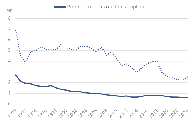 All the coal is imported (0.3 Mt in 2024, half its 2023 level) as Croatia stopped producing coal in 1997. Coal consumption halved from 2010 to 2018 and has been averaging 0.6-0.7 Mt since then (0.6 Mt in 2023), depending on hydropower availability, and even falling by 1/3 in 2024 to 0.4 Mt. Previously, coal consumption more than tripled between 1999 and 2004 following the commissioning of the 210 MW Plomin-2 power plant and remained broadly stable at around 1.1 Mt/year until 2016; it fell by 40% in 2017 after a fire at Plomin-1, where operations have been suspended.