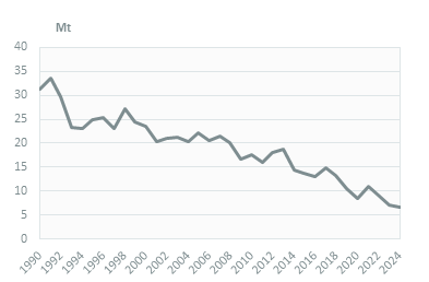 Imports of crude oil declined by 2% in 2024 to 45 Mt, after an 11%/year increase over 2021-2023, while the production of petroleum products remained stable at 47 Mt, after growing by 14%/year over 2022-2023. As a consequence, imports of oil products rose by 1% in 2024 to 38 Mt, after falling by 9%/year in 2022-2023.