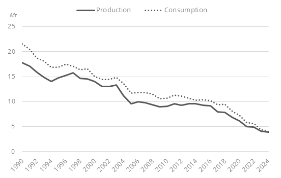 The country only produces lignite. Since 2010, lignite production has been decreasing on average by 6%/year, reaching 3.9 Mt in 2024 (-4.5% in 2024).