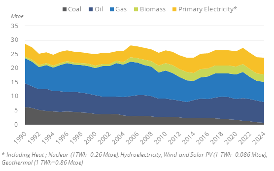 Total energy consumption has decreased rapidly since 2021, by 4%/year, reaching around 24 Mtoe in 2024. It remained broadly stable from 2018 to 2019 and rebounded by 4.6%in 2021, after a 1.5% reduction in 2020; it grew rapidly between 2014 and 2018 (+3%/year).
