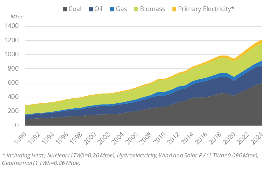 Primary consumption increased by 6.5%/year since 2020 to reach 1 213 Mtoe in 2024, compared to a slower growth before (4.6%/year over 2010-2019). Total energy consumption per capita reached 0.8 toe (2024), half the Asian average.
