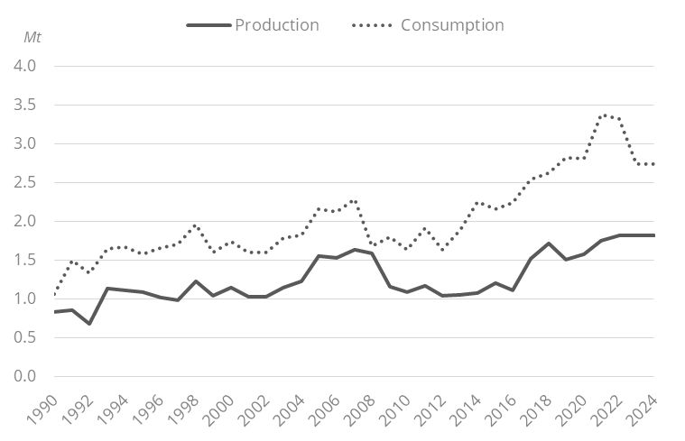 Coal consumption is low and has been quite stable since 2017 (about 2.8 Mt on average). Most consumption is concentrated in industry (>40%). Only two third of coal consumption is covered by domestic production. Most consumption is concentrated in industry (>40%).
