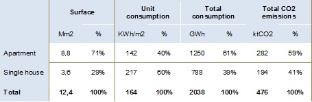The housing stock in Grenoble can be depicted in 40 segments; 5 construction ages x 4 technologies used in heating apartments and identical for single houses. The energy consumption and CO2 emissions for each segment were estimated for 2010 and summarised in the table below.
