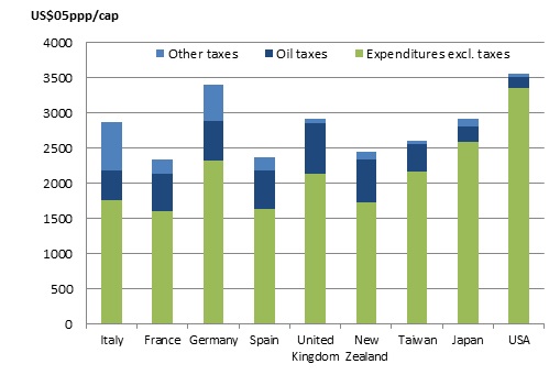 Taxes on fossil fuels represent an important source of revenue for governments as they account for about 3% of government’s budgets in the United States, 5% in Japan, France and the United Kingdom and up to 10% in Germany, Spain and Italy. Among fossil fuel taxes, taxes on petroleum products account for about 50%- of which the major part is directly derived from motor fuel taxes. But these revenues may stagnate and even decline with the continuation of energy efficiency improvement and the switch from fossil fuels to renewables, which are presently subject to much lower -or none- direct tax rates. This trend potentially represents a huge hole in tax income from petroleum products. As a result, governments will probably have to adapt the tax system to this new environment, to maintain this crucial source of revenues. Notes: 1 At exchange rate and purchasing power parities of the year 2005 (US$2005ppp). 2 Respectively 60% for oil and 3 times for gas for Japan -which suffers of high costs of gas supply due to LNG.